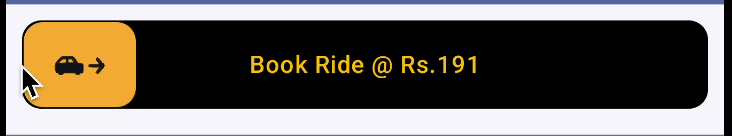 This button allows the user to drag a slider thumb horizontally to confirm a booking. Once dragged past a threshold, the button triggers a ride booking action, plays a subtle animation, and displays a loading indicator.